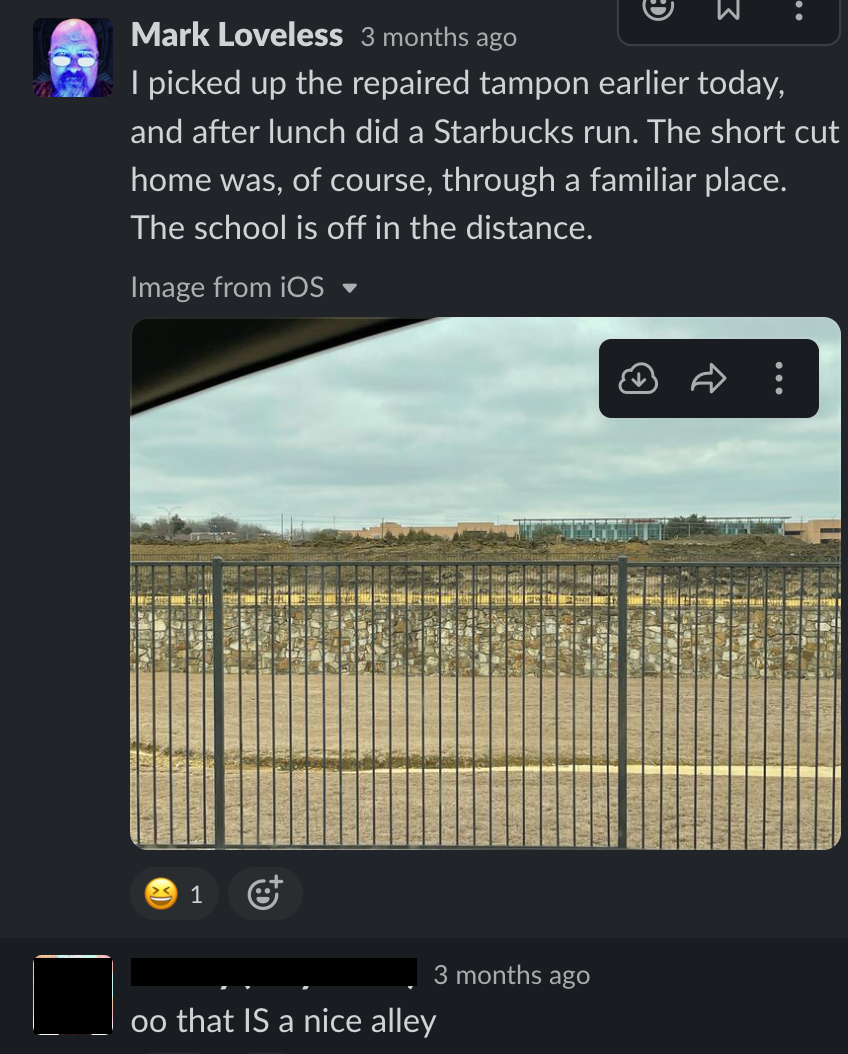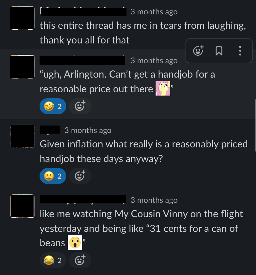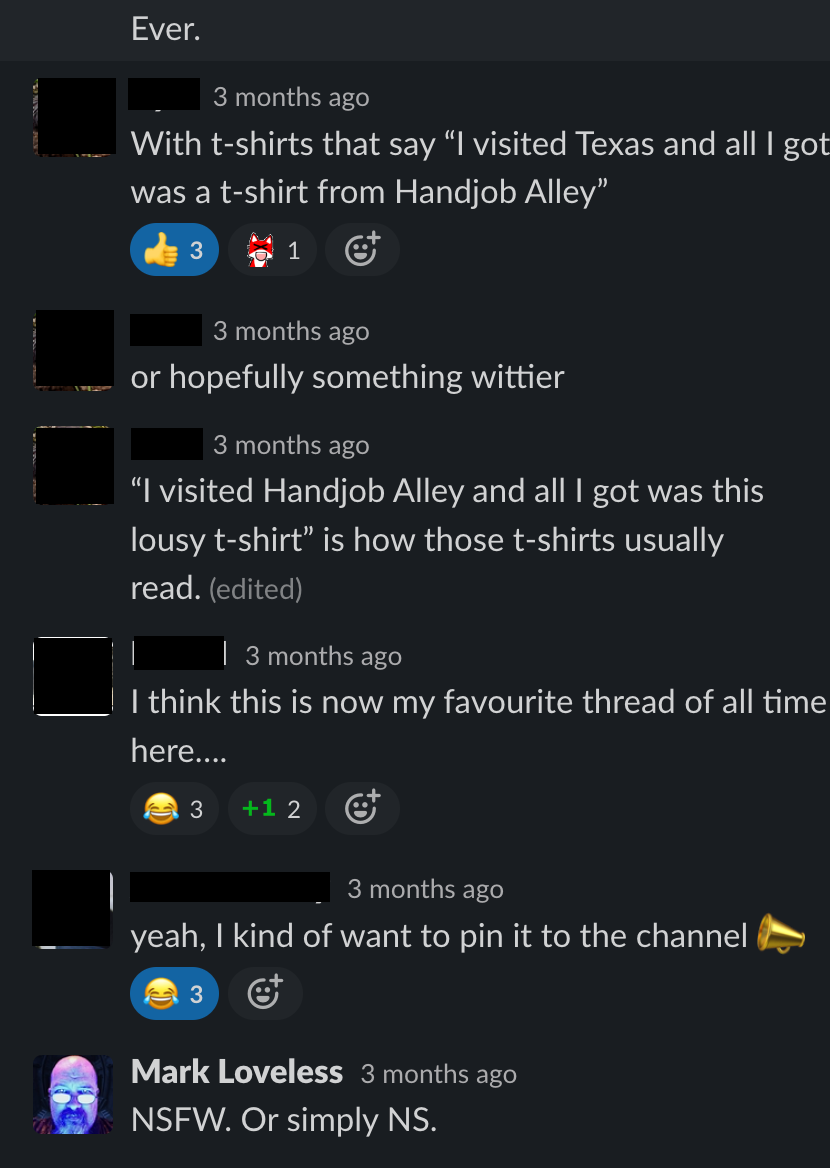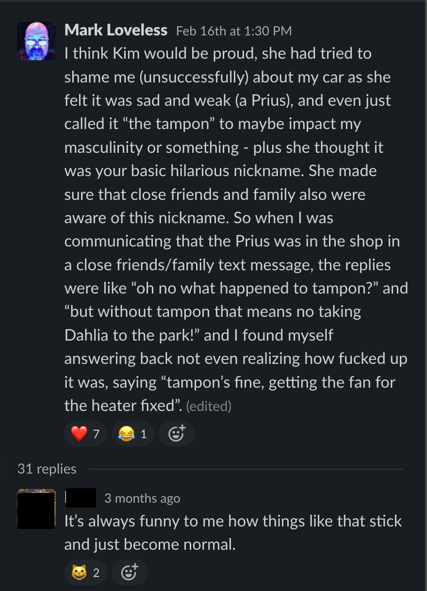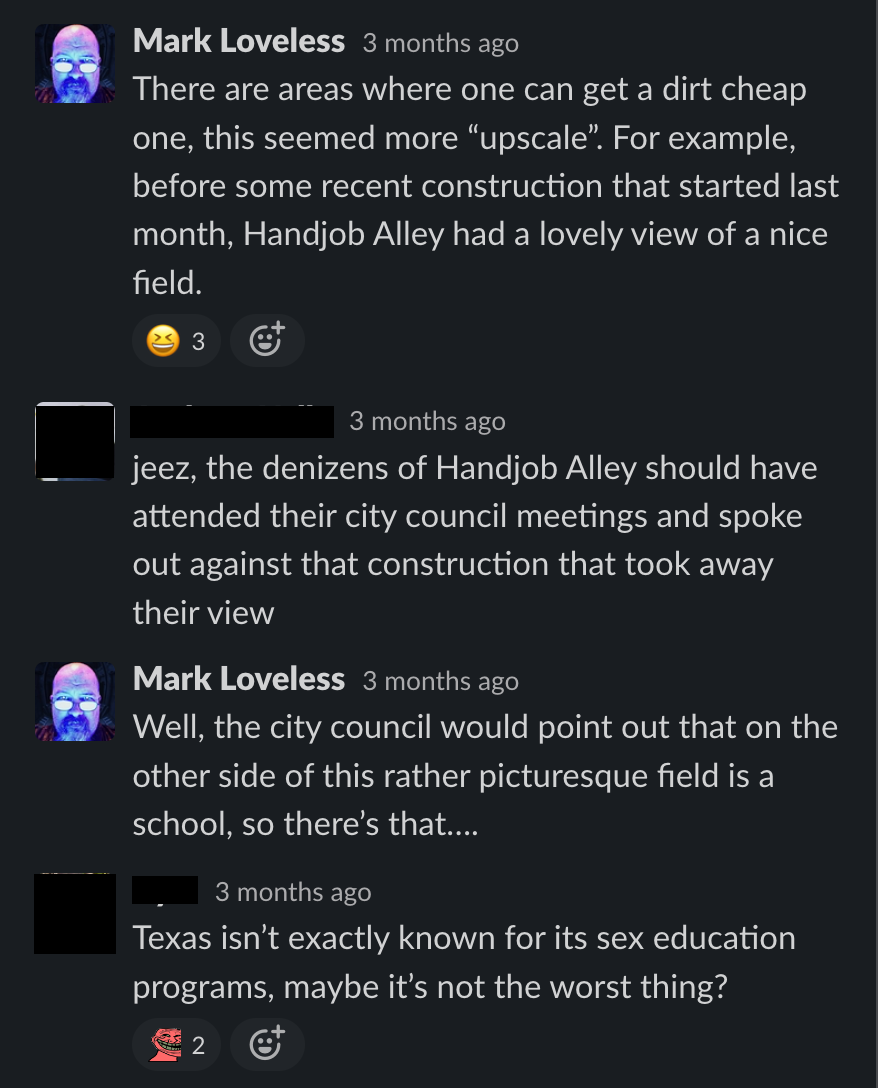 So here it is, the Slack thread that inspired it all, with identities concealed to protect the innocent, except for me. This conversation took place a few short years ago, just a few months after I became a widower. My late wife had a wicked sense of humor, and she'd find the fact that this website even exists to be hilarious.
